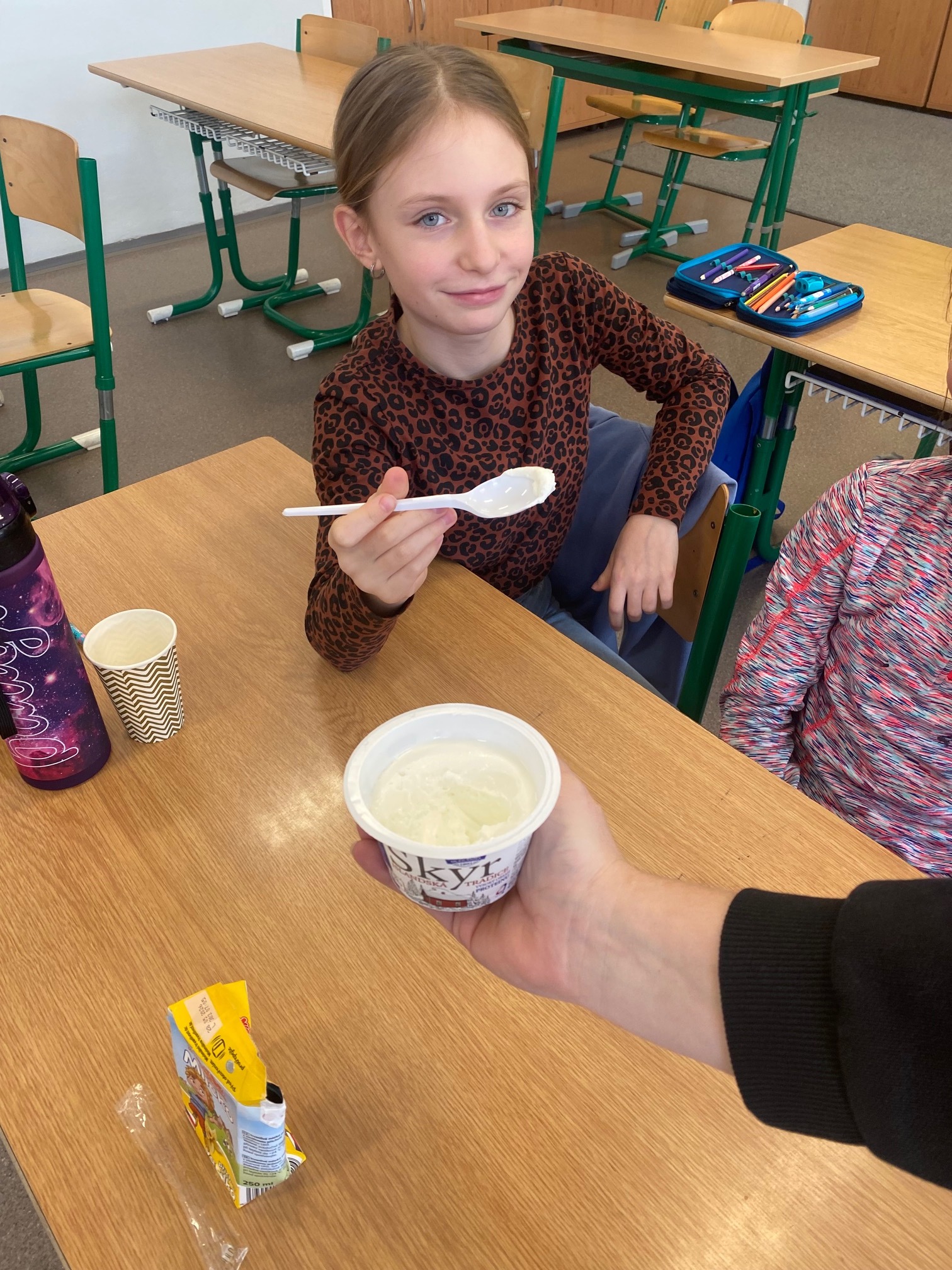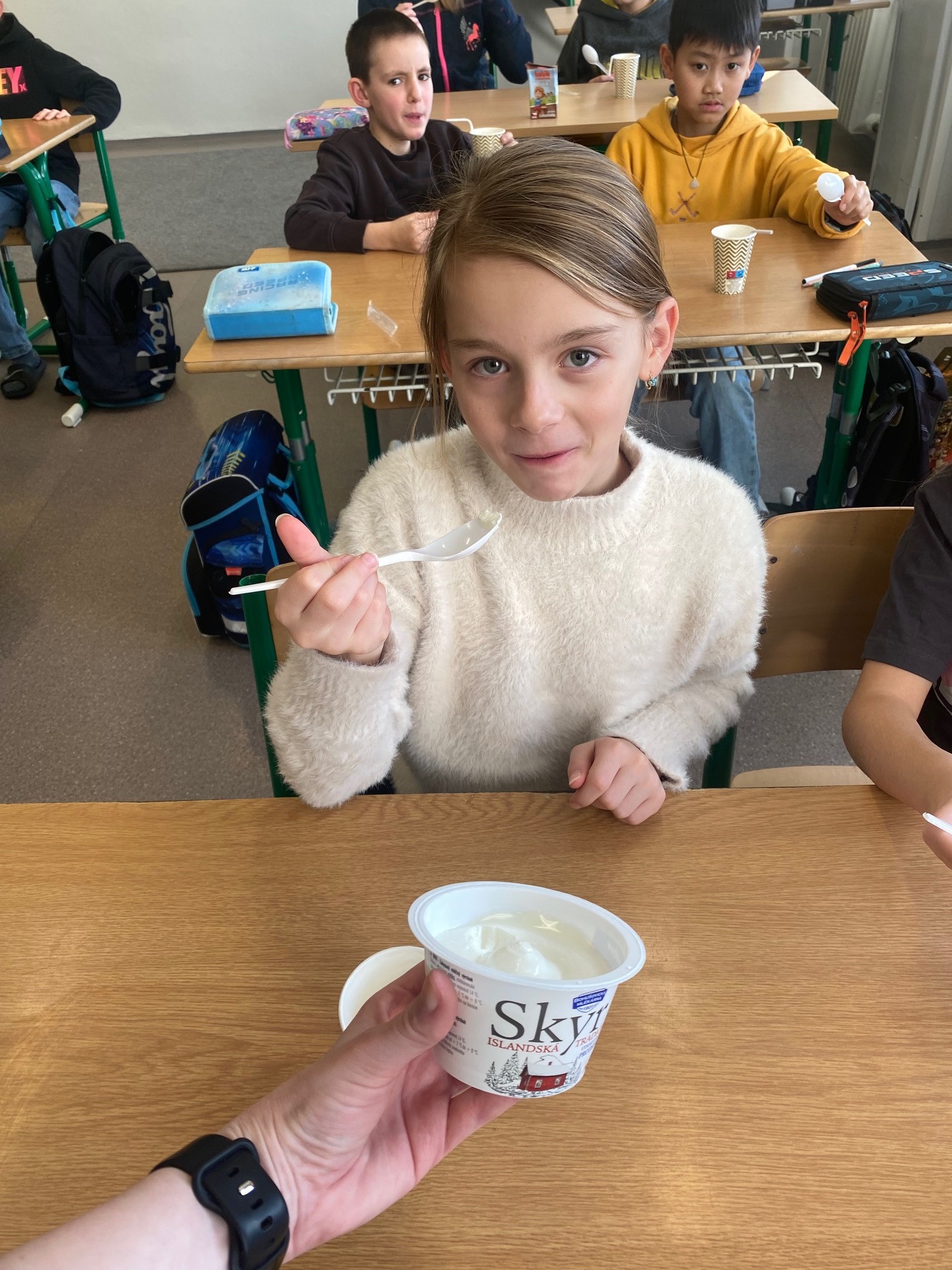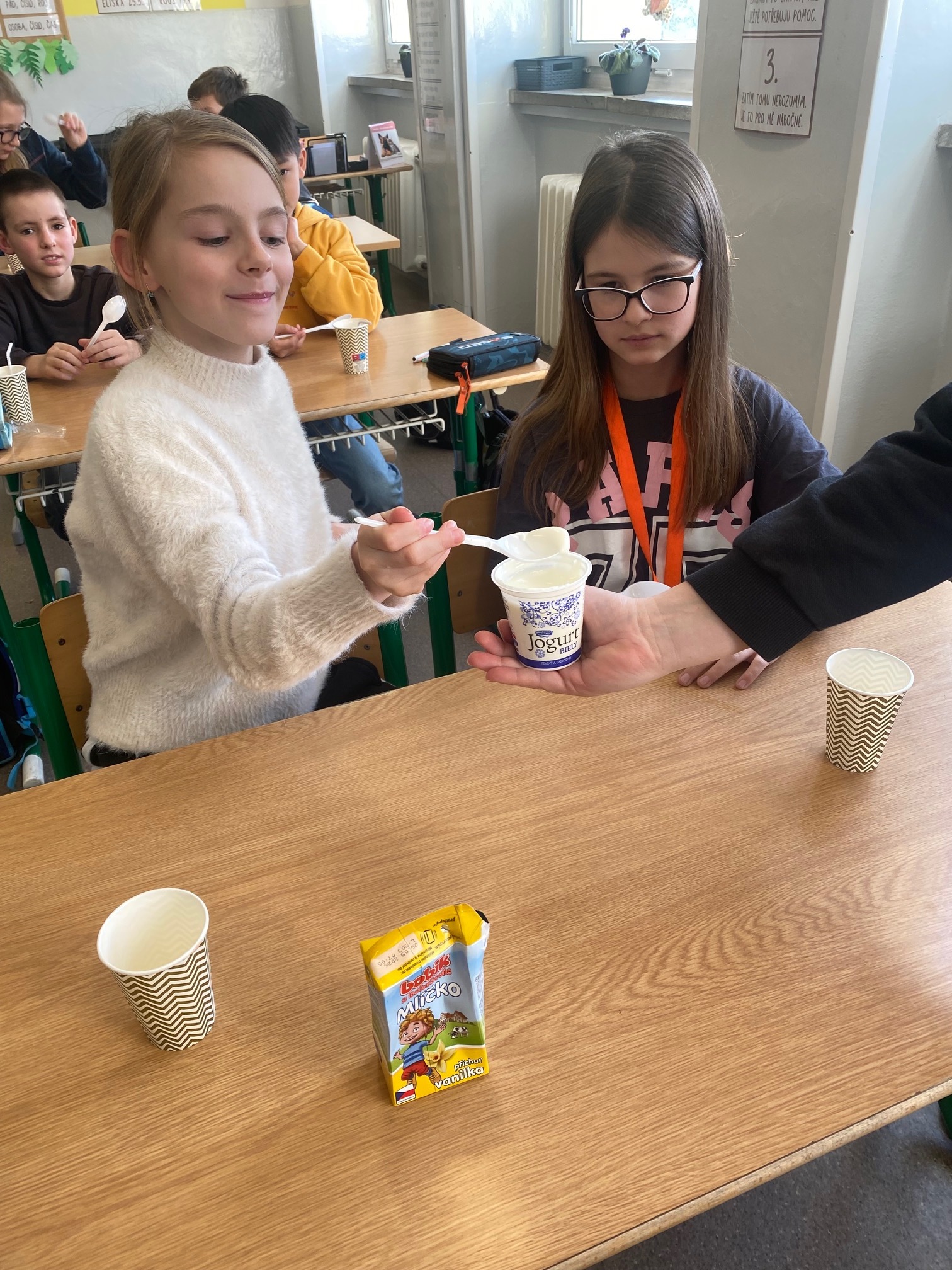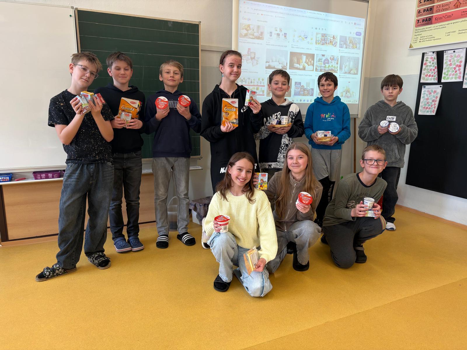 Děti měly příležitost vyzkoušet bílý jogurt, skyr, tvaroh, ochucené mléko a sýr goudu. Většině z nich výrobky velmi chutnaly a někteří žáci si díky ochutnávce našli i nové oblíbené dobroty. Společně jsme si také povídali o tom, proč jsou mléčné výrobky pro naše tělo prospěšné a proč je důležité je zařazovat do jídelníčku.