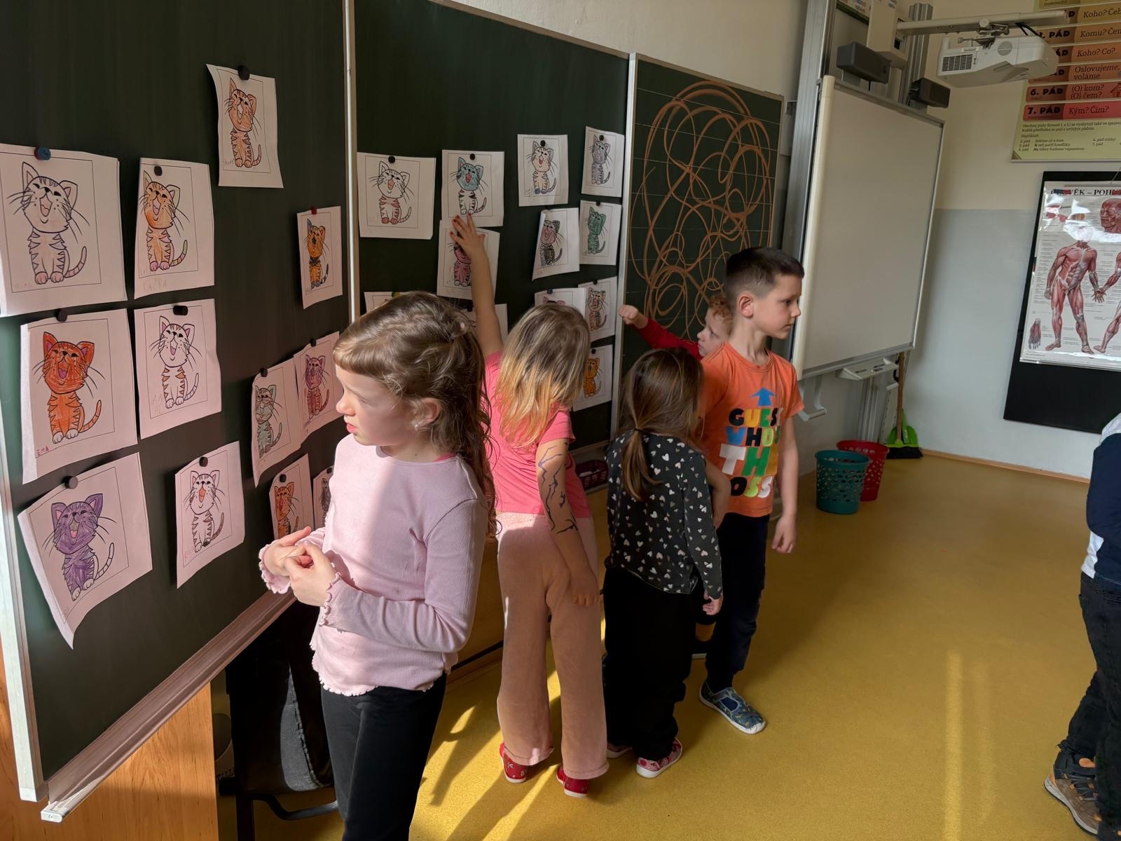 S budoucí paní učitelkou si zazpívali kočičí písničku, nakreslili klubíčko pro kočičku, zmuchlanou papírovou kuličkou se trefovali do koše, vybarvili si obrázek kočičky a nakonec se se všemi paní učitelkami z MŠ vyfotili ve vytvořeném fotokoutku ve škole. Děti si vyzkoušely, kudy se přichází do šatny, kde si odložily bundy a přezuly se a vydaly se na prohlídku školy a třídy. První návštěva budoucí prvňáčků byla vydařená.